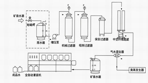 純凈水/礦泵水工藝流程 礦泉水廠生產(chǎn)工藝流程圖: 純凈水/礦泉水廠生產(chǎn)工藝流程(圖): a) 原水泵 主要功能:恒定系統(tǒng)供水壓力,穩(wěn)定供水量 b) 機(jī)械過濾器 采用多次過濾層的過濾器,主要目的是去除原水中含有的錳、鐵重金屬、泥沙、鐵銹、膠體物質(zhì)、懸浮物等顆粒在20um以上的物質(zhì),系統(tǒng)可以進(jìn)行反沖洗、正沖洗等一系列操作。 主要功能:保證設(shè)備的產(chǎn)水量,延長(zhǎng)設(shè)備的使用壽命。 c) 活性炭過濾器 采用果殼活性炭過濾器,活性炭不但可吸附電解質(zhì)離子,還可以進(jìn)行離子交換吸附。經(jīng)活性炭吸附還可使高錳酸鉀耗氧量(COD)由15mg/L(02)降至2-7mg/L(02),此外由于吸附作用使表面被吸附復(fù)制的濃度增加,因而還起到催化作用,去除水中的色素、異味、大量生化有機(jī)物、降低水的余鹵值及農(nóng)藥污染物和除去水中三鹵化物(THM)以及其他的污染物。系統(tǒng)可以進(jìn)行反沖洗、正沖洗等一系列操作。同時(shí),設(shè)備具有自我維護(hù)系統(tǒng),運(yùn)行費(fèi)用很低。 主要功能:保證設(shè)備的產(chǎn)水質(zhì)量,延長(zhǎng)設(shè)備的使用壽命 d) 軟化系統(tǒng) 為防止?jié)馑颂貏e是RO裝置最后一根膜組件濃水側(cè)出現(xiàn)CACO3,MGCO3,MGSO4,CASO4,BASO4,SRSO4,SISO4的濃度大于其平衡溶解度常數(shù)而結(jié)晶析出,損壞膜原件的應(yīng)有特性,在進(jìn)入反滲透膜組件之前系統(tǒng)采用鈉型陽(yáng)離子交換樹脂,進(jìn)行離子交換吸附,去除水中主要硬度成分,吸附飽和后,樹脂失效,可用工業(yè)用鹽進(jìn)行再生樹脂,使之恢復(fù)交換能力。 每套軟化系統(tǒng)包括:軟化罐、控制器(或射流器/鹽泵)、鹽箱及鹽閥 主要功能:防止反滲透摸結(jié)垢,延長(zhǎng)反滲透膜的使用壽命 e) 精密過濾器 精密過濾器用來截留預(yù)處理系統(tǒng)漏過的少量機(jī)械雜質(zhì)。過濾器筒體采用工程塑料或SUS304材質(zhì);內(nèi)裝PPF濾芯。聚丙烯濾芯是一種效率高、阻力小的深層過濾元件。適用于含懸浮雜質(zhì)較低(濁度小于2-5度)的水進(jìn)一步凈化。聚丙烯濾芯由聚丙烯纖維按一定規(guī)律纏繞在注塑聚丙烯多孔管上形成。主要功能:保證進(jìn)入反滲透膜的水顆粒度小于0.1um f) 反滲透系統(tǒng) 反滲透裝置是用足夠的壓力使溶液中的溶劑(一般是水)通過反滲透膜(或稱半透膜)而分離出來,因?yàn)檫@個(gè)過程和自然滲透的方向相反,因此稱為反滲透。 反滲透法能適應(yīng)各類含鹽量的原水,尤其是在高含鹽量的水處理工程中,能獲得很好的技術(shù)經(jīng)濟(jì)效益。反滲透法的脫鹽率提高,回收率高,運(yùn)行穩(wěn)定,占地面積小,操作簡(jiǎn)便,反滲透設(shè)備在除鹽的同時(shí),也將大部分細(xì)菌、膠體及大分子量的有機(jī)物去除。 h)設(shè)備工藝流程圖: 原水→原水增壓泵→多介質(zhì)過濾器→活性炭過濾器→離子交換器→保安過濾器→多級(jí)高壓泵→RO反滲透系統(tǒng)→純水箱→全自動(dòng)桶/瓶水灌裝生產(chǎn)線→包裝→入庫(kù) 一、礦泉水生產(chǎn)工藝流程圖: 目前,我國(guó)給水中應(yīng)用的氧化消毒劑以液氯為主。但隨著源水污染的變化,廢水中各種有機(jī)物的含量有所增加,運(yùn)用液氯消毒會(huì)產(chǎn)生氯代有機(jī)物,其中有的產(chǎn)物具有致突變作用。為滿足人們對(duì)水質(zhì)要求 的不斷提高,尋求能替代氯的更安全而經(jīng)濟(jì)的新型氧化消毒劑,成為今后給水處理的一個(gè)發(fā)展方向。其中,較有前途的是二氧化氯(ClO2)和臭氧(O3)。 1.二氧化氯(ClO2) 1.1二氧化氯的應(yīng)用 十九世紀(jì)初,美國(guó)科學(xué)家DaryH.發(fā)現(xiàn)了ClO2氣體。二十世紀(jì)40年代,二氧化氯開始應(yīng)用于食品加工的殺菌消毒,造紙的漂白和水的凈化處理等。由于二氧化氯不會(huì)與有機(jī)物反應(yīng)而生成THMs,所以在 飲用水處理中應(yīng)用越來越廣泛。1983年,美國(guó)國(guó)家環(huán)保局(EPA)提出飲用水中三氯甲烷含量必需低于0.1mg/L,并推薦使用ClO2消毒。二氧化氯消毒的安全性被世界衛(wèi)生組織(WHO)列為A1級(jí),被認(rèn)定為 氯系消毒劑最理想的更新?lián)Q代產(chǎn)品。目前,美國(guó)和歐洲已有上千家水廠采用ClO2消毒;我國(guó)則多用于造紙、紡織等行業(yè),并逐步應(yīng)用于自來水廠。 在給水處理中,ClO2不僅可以作為高效的消毒劑,還可考慮投加在原水、沉淀池前或?yàn)V池前,進(jìn)行預(yù)氧化或中間氧化,以控制嗅味(尤其是氯酚或藻類副產(chǎn)物嗅味等),防止微生物滋長(zhǎng),加強(qiáng)混凝 過濾;也可用于去除水中的鐵、錳和色度。另外,歐洲一些國(guó)家將ClO2、O3即Cl2結(jié)合起來用于飲用水處理,取得了較好的效果。 1.2二氧化氯的物理性質(zhì) 二氧化氯(ClO2)常溫(20℃)下是一種黃綠色的氣體,具有與氯氣、臭氧類似的刺激性氣味,分子量67.45,比空氣重,熔點(diǎn)-59℃,沸點(diǎn)11℃。 ClO2極易溶于水而不與水反應(yīng),22℃時(shí)溶解度約為氯的5倍,達(dá)2.9g/L。ClO2在水中的溶解度隨溫度升高而降低。同時(shí)二氧化氯分子的電子結(jié)構(gòu)雖是不飽和狀態(tài),在水中卻不以聚合狀態(tài)存在,這對(duì) ClO2在水中迅速擴(kuò)散十分有利。但ClO2水溶液易揮發(fā),在較高溫度與光照下會(huì)生成ClO2-與ClO3-,應(yīng)避光
